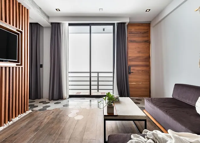 El apartamento está situado en el distrito Centro, a unos 500 metros del Museo 3D de las Maravillas. El Portal Maya está a unos 1 km del Leaf Boutique Condos, mientras que la estación de autobuses Panteon de los mormones está bastante cerca de la propiedad. La propiedad se encuentra a unos 10 minutos en coche de la Punta Esmeralda.